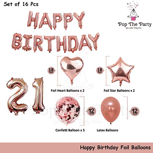 HomeBabyParty SuppliesPop The Party 21st Year Birthday Party Decorations Rose Gold Supplies Big Set with Happy Birthday Balloons Banner and 21 Digit Balloon for Including Latex, Star, Heart and Confetti Balloons