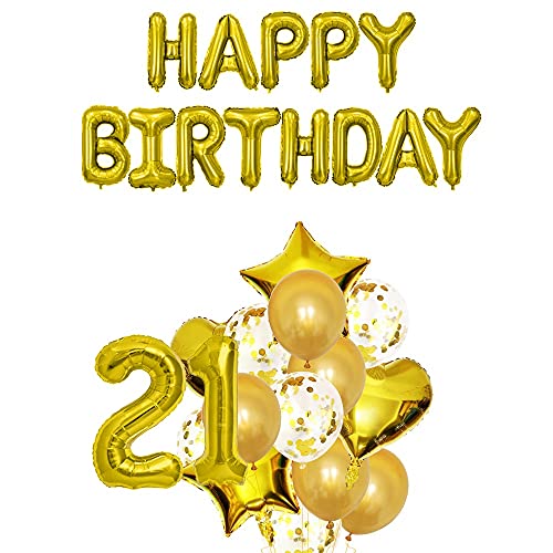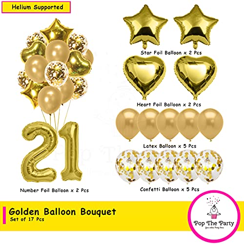 HomeBabyParty SuppliesPop The Party 21th Birthday Party Decorations Gold Supplies Big Set With Happy Birthday Balloons Banner and 21 Digit Balloon for Including Latex, star, heart and Confetti Balloons