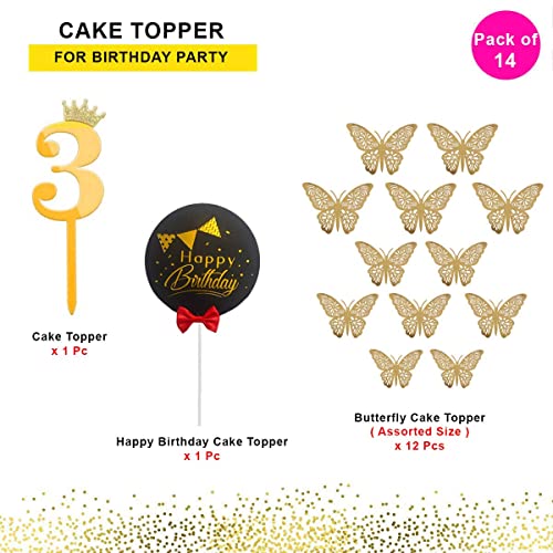HomeBabyParty SuppliesPop The Party 3rd Birthday Cake Decorations Gold Supplies Big Set with Black Happy Birthday Cake Topper, 12 Butterfly Cake Topper and 3 Digit Cake Topper