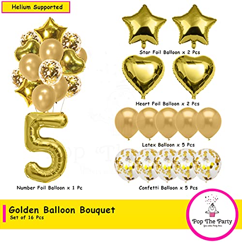 HomeBabyParty SuppliesPop The Party 5th Birthday Party Decorations Gold Supplies Big Set With Happy Birthday Balloons Banner and 5 Digit Balloon for Including Latex, star, heart and Confetti Balloons