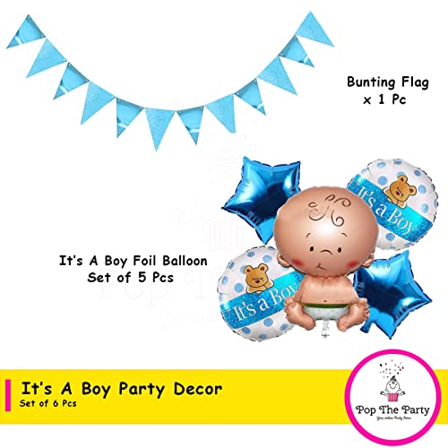 Pop The Party 6 pcs Baby Boy set , Blue Star , Round Balloon and Bunting Flag for Baby shower Decoration