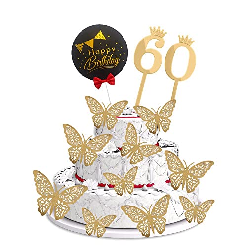 HomeBabyParty SuppliesPop The Party 60th Birthday Cake Decorations Gold Supplies Big Set with Black Happy Birthday Cake Topper, 12 Butterfly Cake Topper and 60 Digit Cake Topper