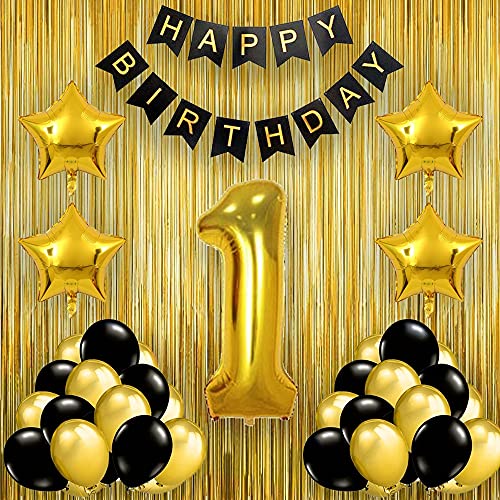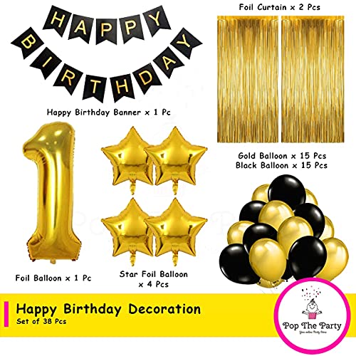 HomeBabyParty SuppliesPop The Party Black Gold 1st Birthday Party Decorations with Birthday Banner, Star, Latex Balloons, Curtains and 1 Digit No. Set of 39 Supplies