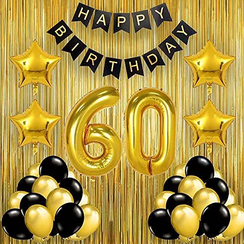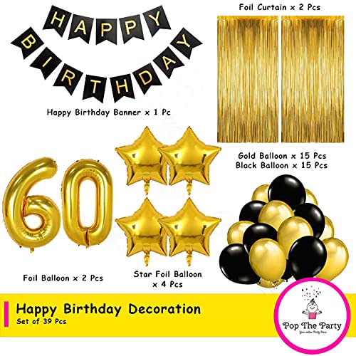 HomeBabyParty SuppliesPop The Party Black Gold 60th Birthday Party Decorations with Birthday Banner, Star, Latex Balloons, Curtains and 60 Digit No. Set of 39 Supplies