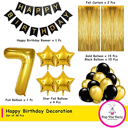 HomeBabyParty SuppliesPop The Party Black Gold 7th Birthday Party Decorations with Birthday Banner, Star, Latex Balloons, Curtains and 7 Digit No. Set of 39 Supplies