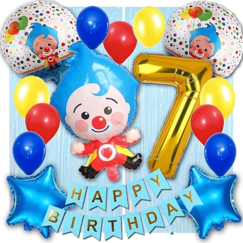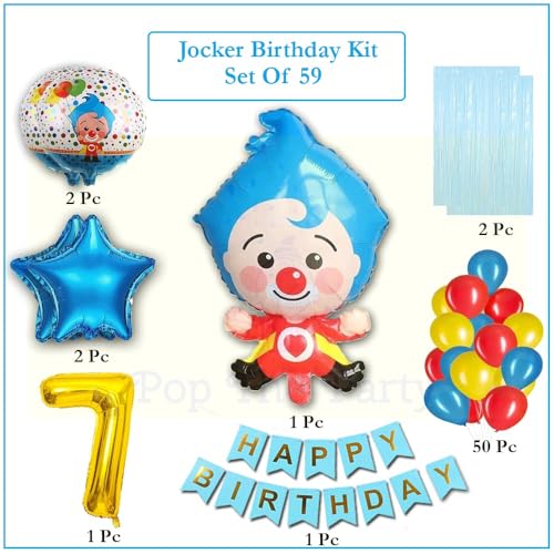 • Package Included - Total 59Pcs Clown Foil Balloons Kit. 1Pcs Clown Character Foil Balloons 2Pcs Star Balloons2Pcs Round Balloons. 50Pcs Multi Color Pastel Balloons1Pcs Blue Happy Birthday Banner 2Pcs Blue Pastel Foilcurtains1Pc 7Number Gold Foil Balloon 1