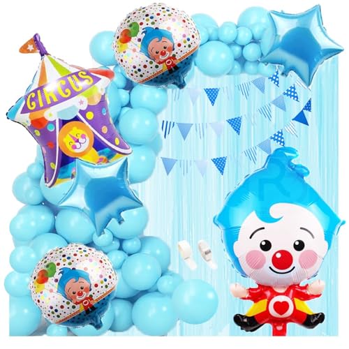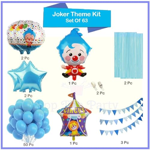 Package Includes5Pcs Joker Theme Foil Balloon Set 1Pcs Circus Foil Balloon 2Pcs Pastle Blue Curtain 3 Pcs Blue Polka Flag 50Pcs Pastle Blue Balloon 1Pcs Glue Dot 1Pcs Balloon Arch