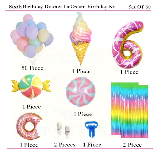 • Package Included - Total 60Pcs Ice Cream Balloons Arch Kit. 1Pcs Ice Cream Balloons 50Pcs Multi Color Pastel Balloons 1Pc Tying Tool1Pc Balloon Arch Strip1Pc Glue Dot1Pcs Candy Shaped Balloons 2Pcs Curtains1 Pcs Candy Foil Balloon 1Pc 6 Number Candy Foil