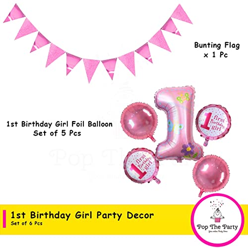 Pop The Party First Birthday Girls Decoration Set with Round Foil Balloon and Bunting Banner (Set of 6)