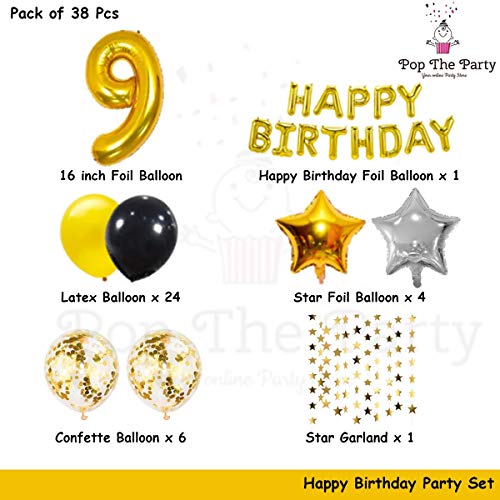 HomeBabyParty SuppliesPop The Party Golden and Black 9th Birthday Party Decorations Set- Gold Happy Birthday Banner,Foil Number Balloons, Latex Balloons and More for 9 Years Old Birthday Party Supplies
