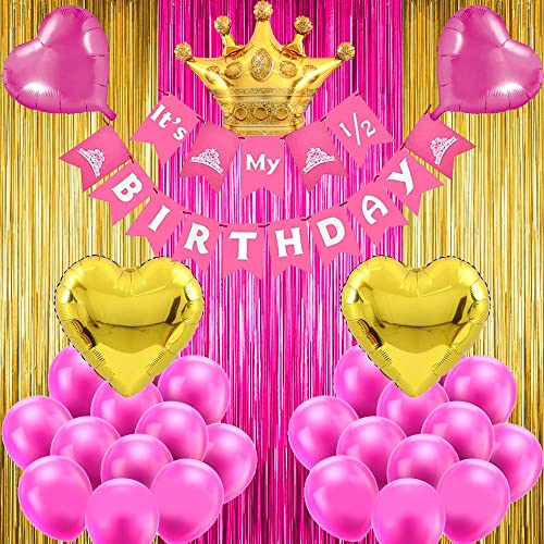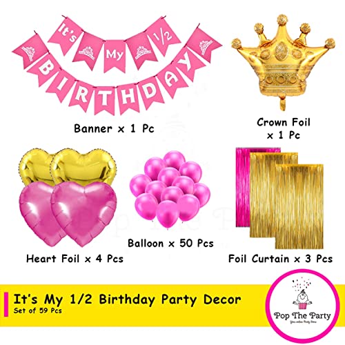 HomeBabyParty SuppliesPop The Party Half Birthday Decoration Kit fot Baby Gir Set of 59 for 6 month birthday with 1/2 Birthday Banner, Crown Baloon, Curtain, Latex and Heart Balloon