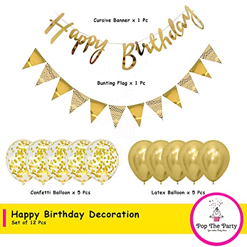Pop The Party Happy Birthday Cursive Banner with Gold Bunting and Gold Confetti, Latex Balloons