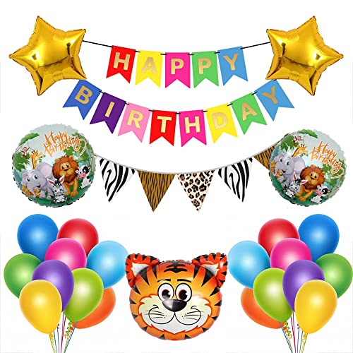 • Package Includes: This Beautiful Jungle Theme Party Decorations Set Include: 1X Happy Birthday Banner1 X Triangle Bunting50Pcs Multi Balloon1 Tiger Foil Balloon2 Round Balloon2 Star Foil Balloon