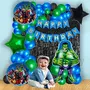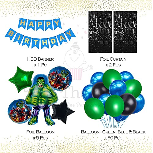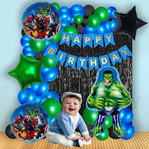 Hero Themed Party Balloon Kit 58 Pcs Green Black Blue Latex Balloons With Happy Birthday Banner With Black Curtain Andhero Foil Balloons For Birthday Party Decorations