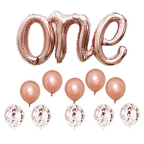 Pop The Party Rose Gold ONE Balloons Banner, Foil Mylar Balloon for 1st Birthday Party,Baby Shower,Wedding,Engagement,Anniversary Party - Extra Pack of 10 Latex Balloons(Rose Gold, Confetti)& String