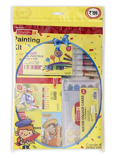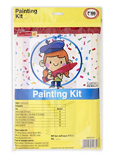 Everything your child will need to begin painting. Camlin presents a range of non-toxic water colours in cake form with excellent colouring strength developed specially for students. Item includes: Box of Water Colour Cake - 24 shades Drawing Book - 1 quantity Sketch pen (12 Shades) 4 Brushes .