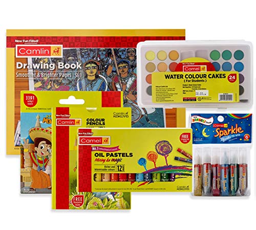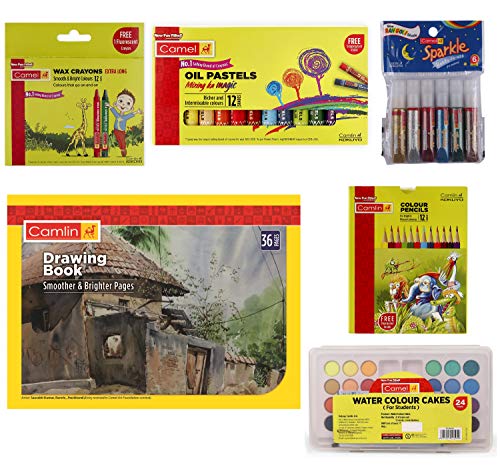 1 Drawing Book 1 Set of Water Colour Cake 1 Set of Wax Crayon1 Set of Colour Pencil 1 Set of Oil Pastel 1 Set of Sparkles