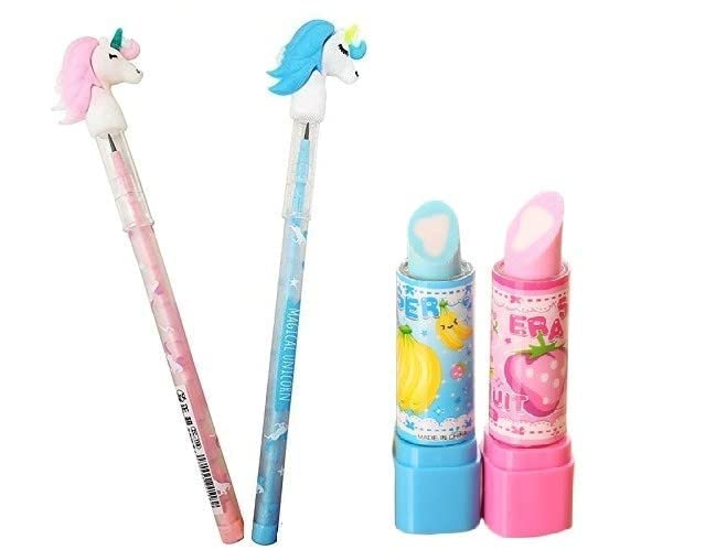 Combo Of 2 Unicorn Pencil And 2 Lipstick Shape Eraser| Beautiful Attractive Art Design Unique Best Quality Non- Toxic Eraser With Non Sharpening Push Bullet Pencil For Kids Birthday Return Gift Party Favor Gift (Multicolor Multi Design)