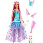 • Barbie Malibu wears a layered dress with wing accents at the neckline. Her long tulle skirt shines with stars while glittery arm cuffs give her wings and enhance her magical outfit!