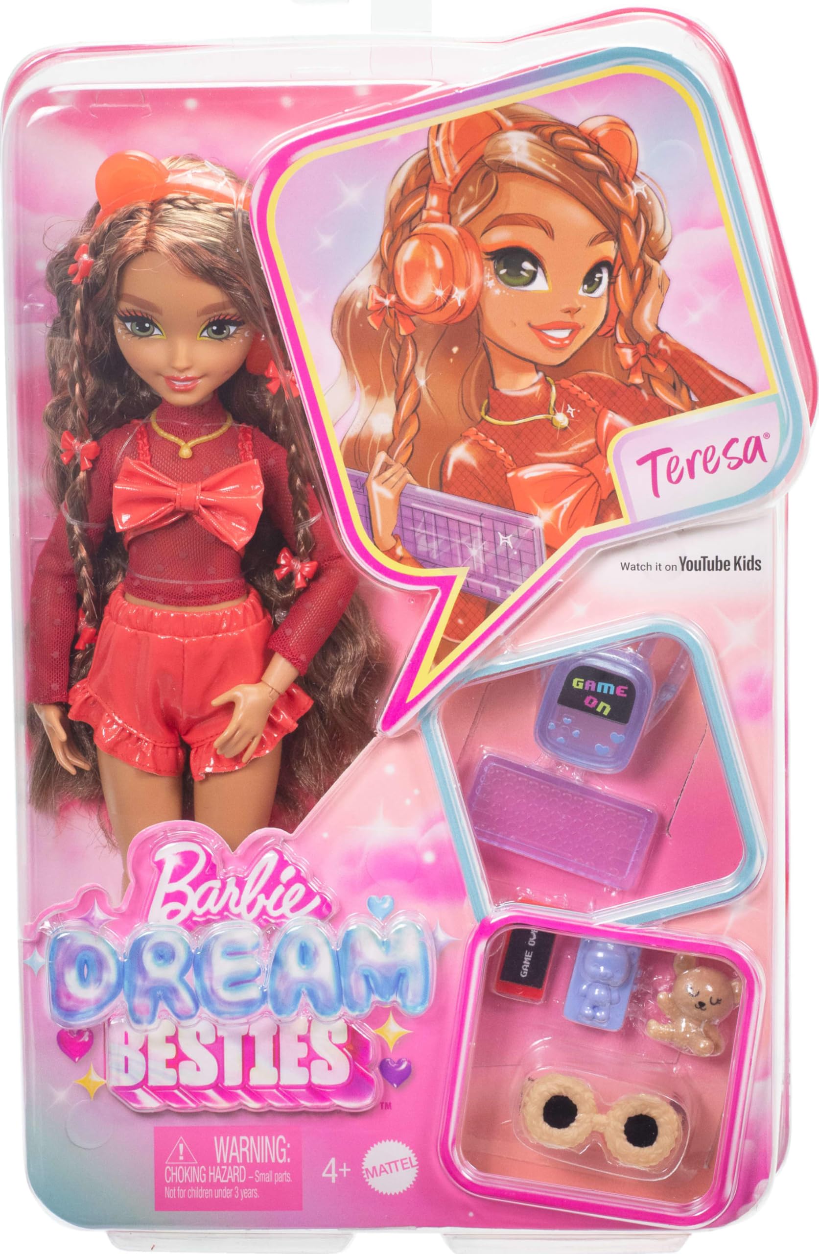 The Barbie Dream Besties dolls encourage kids to share their unique talents with the world just like Teresa! Teresa dreams of starting her own video game company help her make them a reality with video game themed accessories like her headphones keyboard and video game backpack. The fashion doll also includes long hair with red bow hair clips for styling fun! The Barbie Dream Besties dolls inspire kids ages 4 years old and up to live out their dreams. Doll cannot stand alone. Colors and decorations may vary.