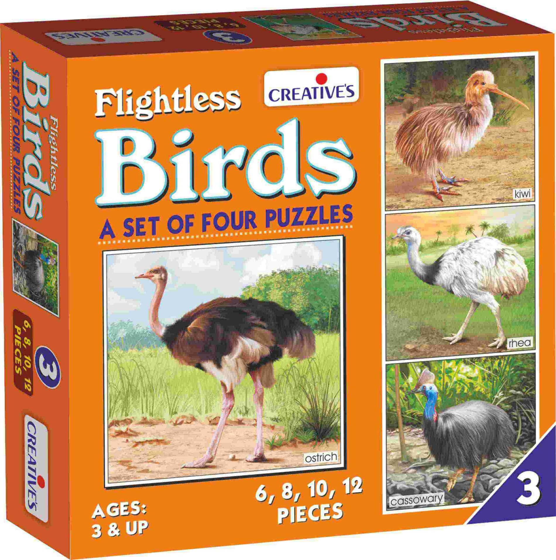 This puzzle is designed for younger children and includes 1 x 6 piece 1 x 8 piece 1 x 9 piece and 1 x 12 piece puzzle. The pictures are of birds.