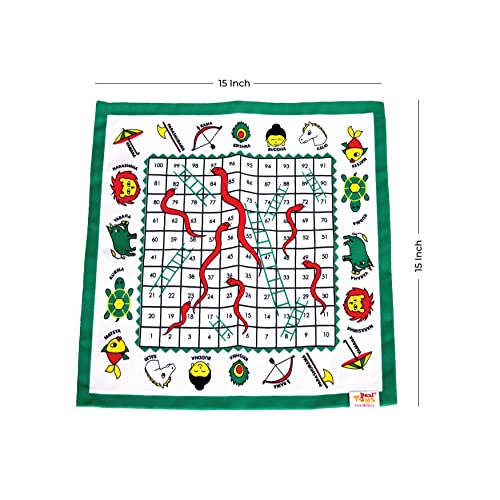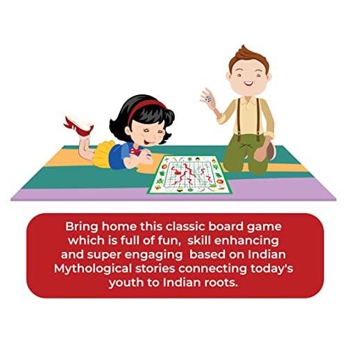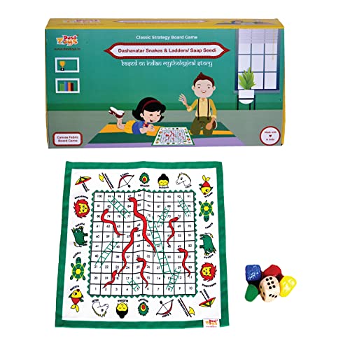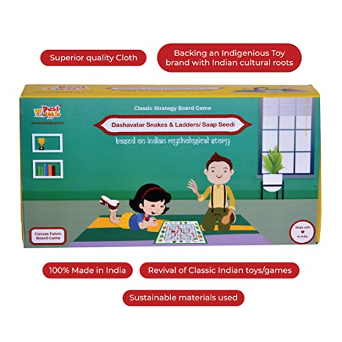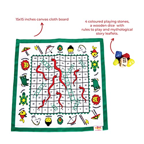 • DIMENSIONS & CONTENT: 1 Canvas Fabric Snakes & Lers board 15 × 15 inches along with a guidebook containing the game's instruction & 10 mythological stories of Dashavatar