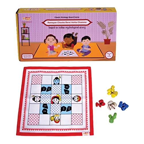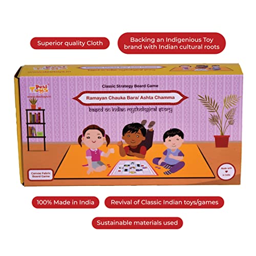 Desi Toys Ramayan Chauka Bara/Ashta Chamma | Canvas Fabric Board | Indian Mythological Themed | Logic & Strategy Board Games | Indian Ludo | 15"x15" Play Mat | Family Games for Adults and