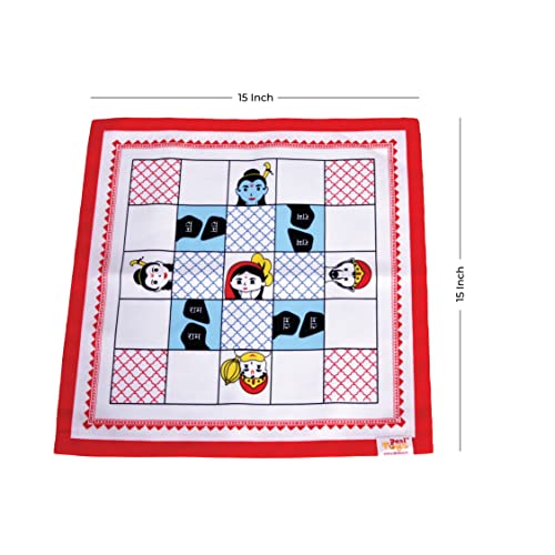 • DIMENSIONS & CONTENT: 1 Canvas Fabric Chauka bara board 15 × 15 inches 16 colored stones & 4 cowrie shells along with a guidebook containing game's instruction & mythological stories leaflets.