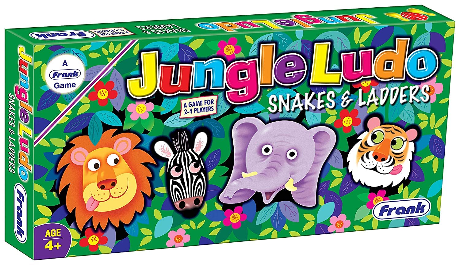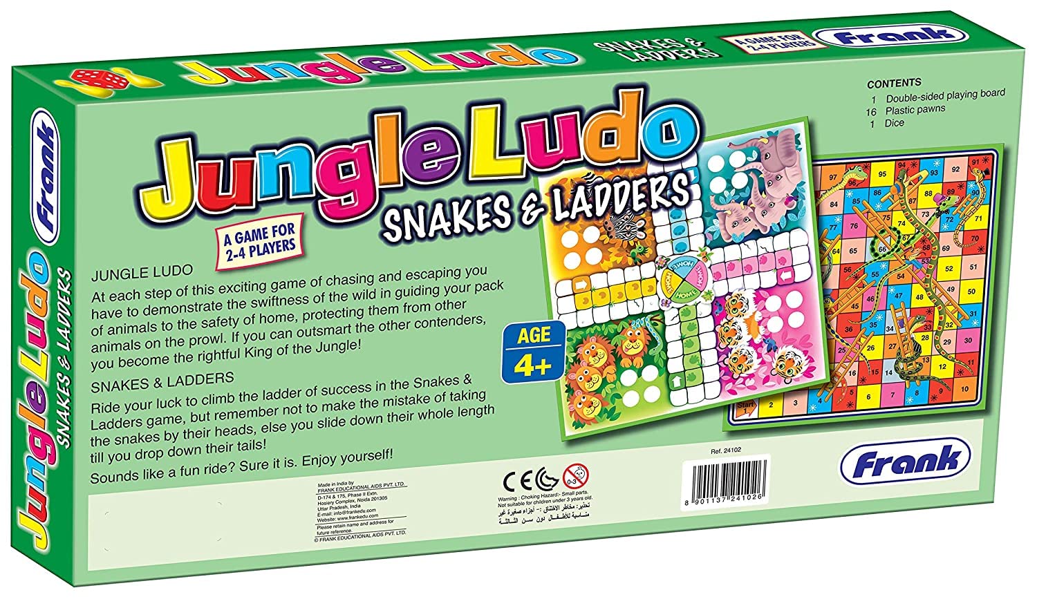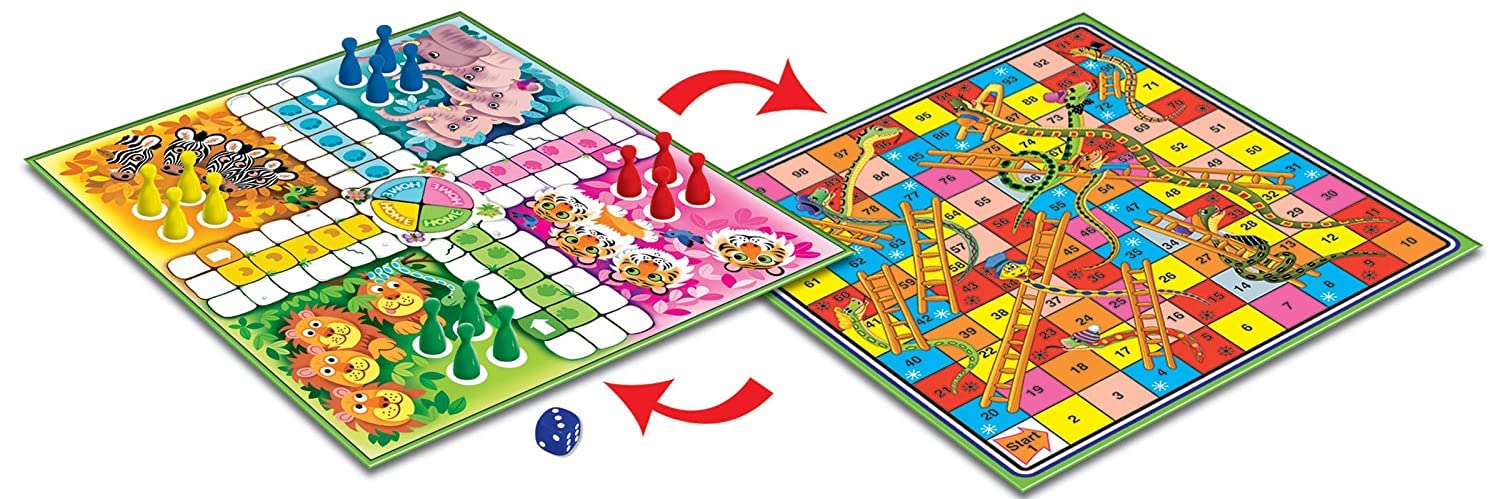 JUNGLE LUDO: At each step of this exciting game of chasing and escaping you have to demonstrate the swiftness of the wild in guiding your pack of animals to the safety of home protecting them from other animals on the prowl. If you can outsmart the other contenders you become the rightful King of the Jungle! SNAKES & LADDERS: Ride your luck to climb the ladder of success in the Snakes & Ladders game but remember not to make the mistake of taking the snakes by their heads else you slide down their whole length till you drop down their tails! The new Jungle Ludo and Snakes & Ladders are suitable for children of the age 4 years and above in a group of 2-4 people. The board has a double-sided back to the back printed layout revealing two different games increasing your children fun and excitement all in one box together. Let your kids indulge in this game with family and friends while learning patience persistence and developing their concentration powers.