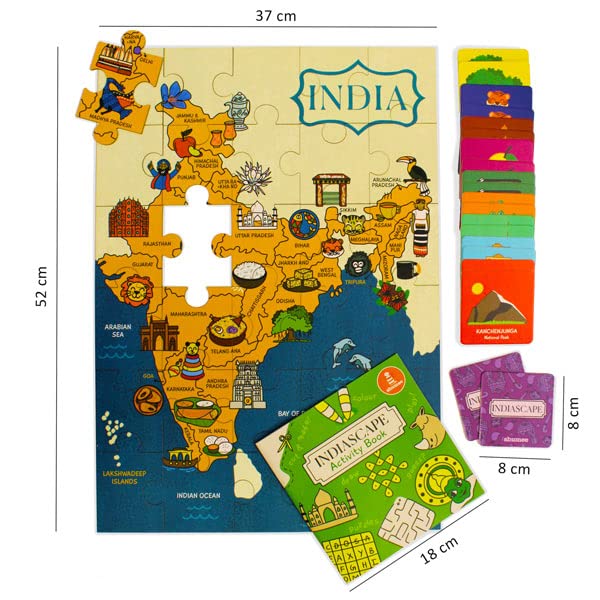 WHAT WILL I GET -- A set of India-themed memory cards with 10 pairs illustrating the national emblem animal bird fruit and more. - A super fun activity book with 15+ different kids activities. - A large 30-piece floor puzzle of the map of India. The map m