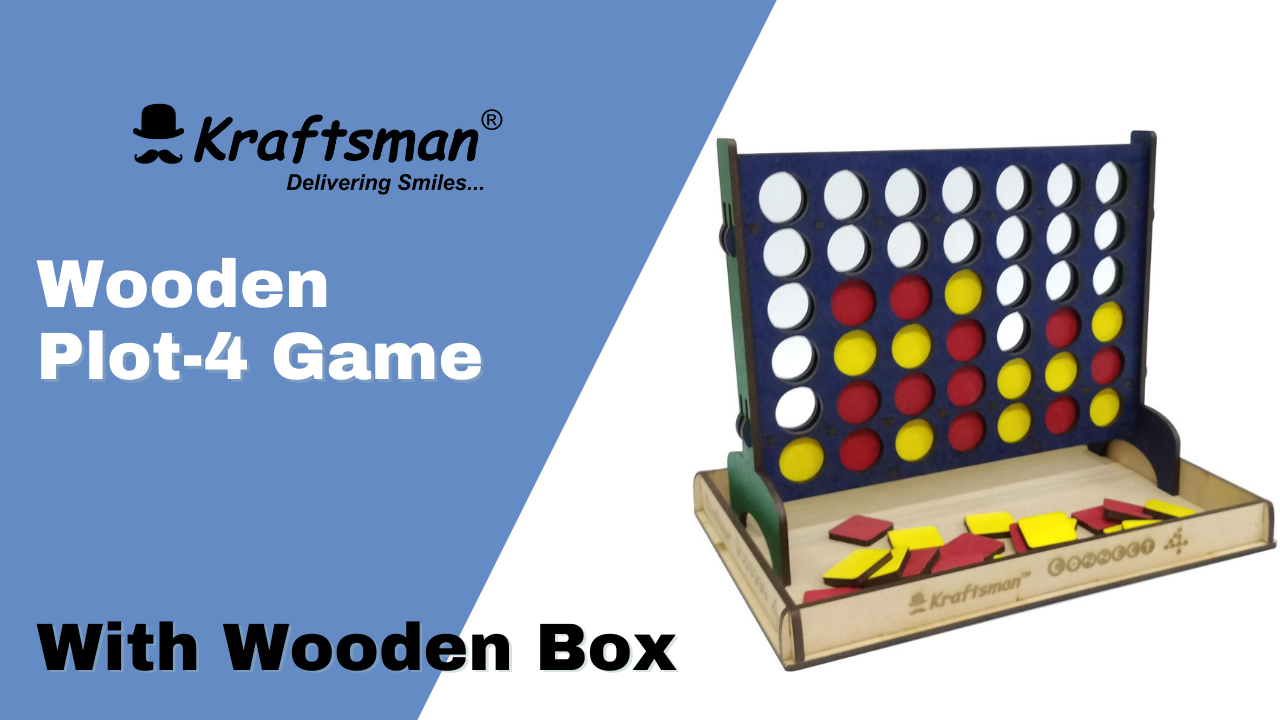Wooden Plot 4 OR Get-4 in a Row Grid Game is a strategy game from Kraftsman that will result in laughs and learning. The Original Game of Get-4 in a Row is designed to enhance logical thinking without taxing the child's brain with unnecessary fundament. Spend some quality family time with your with this Wooden Plot-4 Strategy Game. Every person must have played this game in their childhood. The game is 100% . The product is made up of high-quality engineered wood by experienced woodworkers. Wooden Plot 4 Strategy Game Components: 1 Wooden Grid to put the tiles a pair of wooden stands to stand the grid vertically 42 double-sided color tiles and a wooden tray box to keep the game safe. Game Rules: The Wooden Plot 4 game is a strategy game in which 2 players go head-to-head in a battle to own the grid. The players have to choose any one color from the tiles discs. The game is played by dropg checkers into slots one by one and completing a line of the first four checkers to create a horizontal vertical or diagonal line providing ultimate challenges in interpretive analysis and advance planning. Players can apply their own strategy to block the opponent while aiming to be the first player to get 4 discs in a row to win. The Plot 4 game is a great choice for gifting purposes. A wooden box is o included with the game you can use this box as a tray while playing the game and keep the game in the box to keep it safe. This wooden box makes it easy to carry along anywhere wherever you go. The best piece to kill your time while traveling. The material used is 100% . Challenge your friends and Family member anytime with this great game of all time. The best traveling game of all time.