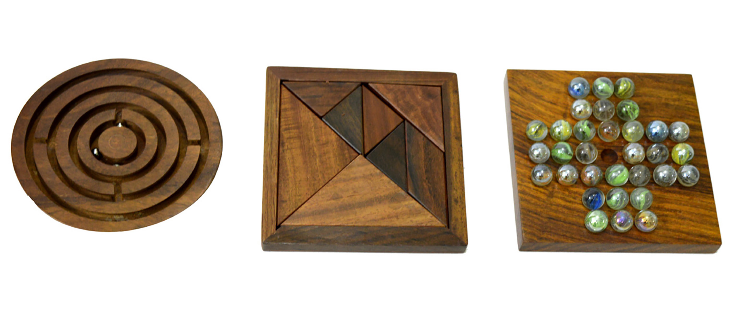 An engrossing set of three puzzles crafted in polished wood to engage your grey cells and pose a light hearted challenge at any soiree. Created for all the beautiful minds by the artisans from Uttar Pradesh, India.