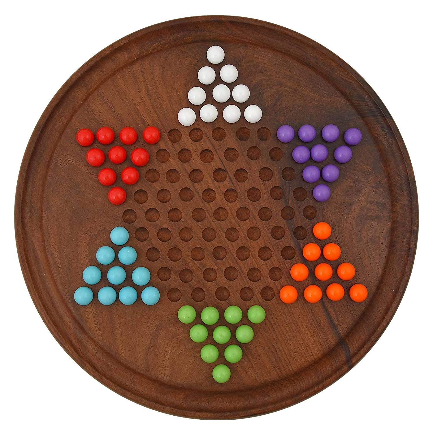 VARANASI WOODEN TOYS Chinese Checkers Game Set with 12 Inch Diameter Round Wooden Board and Acrylic Beads for 6 years
