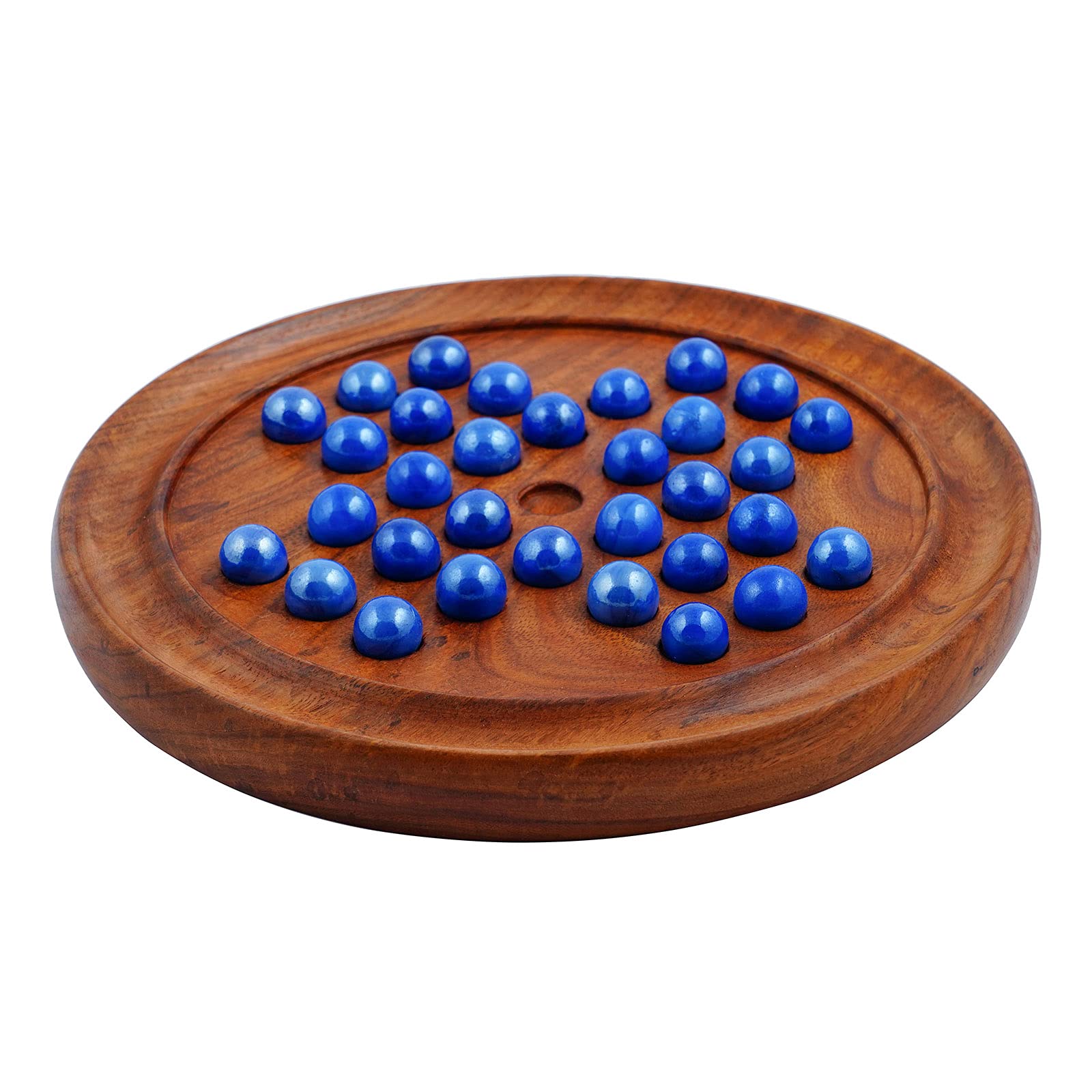 The Ancient Egyptians developed the first set of marbles creating a game that is every bit as enjoyable and popular today as it was centuries ago. With our Handmade Indian Round Wooden Game Board Gifts Set with Glass Marbles you can enjoy this traditional game while adding an exquisite decoration to your decor.The Handmade Indian Round Wooden Game Board Gifts Set with Glass Marbles is entirely hand crafted by talented woodworkers from the Uttar Pradesh region of North India. Fabricated out of Sheesham hardwood the game board has a recessed middle that helps to keep marbles in place. A trough around the outer edge of the board provides a place for storing marbles during game play. In the middle recessed holders are provided for ease of setup. The board measures 8 inches in diameter providing plenty of space for shooting and rolling. With its smooth finish the game board is free of rough sharp edges for safe enjoyment hour after hour.With the Handmade Indian Round Wooden Game Board Gifts Set you'll receive a storage bag filled with beautiful marbles. Each one is produced by hand and there are a number of styles included from solid-coloured marbles to transparent marbles with beautiful swirling decorations inside. All of the marbles are standard sized and perfectly polished for a lustrous attractive finish that enhances their appeal. The addition of the marbles to the gifts set gives you everything that you need to enjoy a game at home or on the go.Not only will our Handmade Indian Round Wooden Game Board Gifts Set with Glass Marbles make a wonderful decoration for your own home and provide hours of enjoyment for you and your family but it also a popular choice of gifts for a variety of occasions. School-aged children teenagers and adults all love the game of marbles making the gifts set a unique present for virtually anyone.