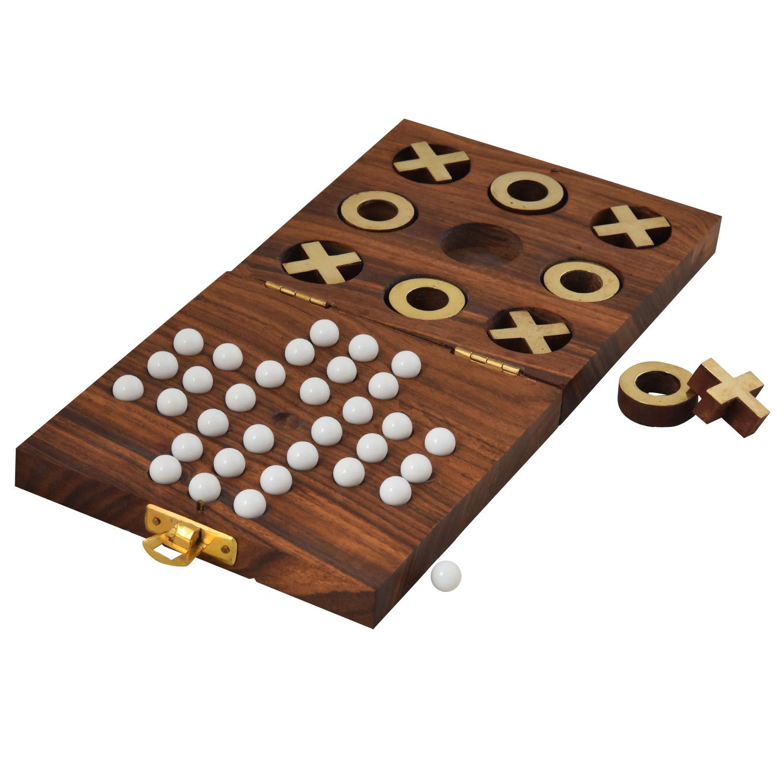 This is a 2 in 1 wooden board games set consisting of tic tac toe and solitaire. It comes in square shaped box. One side of the open top lid functions as tic tac board and the other side functions as solitaire board. Wooden pieces for tic tac toe and balls for solitaire. The twin game set is made in high quality wood and is handcrafted . Tic tac toe may be a simple game to play but it can keep children entertained for hours. Rules: Remove the central hole peg before you begin play the game.The player takes a ball and jups horizontally or vertically but never diagonally over the adjacent ball to the empty hollow beyond it.The ball that has been jumped over is removed from the board.The player repeats this until it is no longer possible to jump over any more balls. The game level: The last remaining 6 or more pieces is "general";The last remaining 5 pieces is "good ";The remaining 4 pieces are "very good";The remaining 3 pieces are "smart";The remaining 2 pieces are the "top";The remaining 1 pieces is "master";Material : Wooden Package: 1*Solitaire game board with 33 balls About The Brand: VARANASI WOODEN TOYS Home & Lifestyle is establish in the year 2016. We are Manufacturer. Supplier Exporter of Wooden Handicrafts etc. We have perfect Indian handcrafts. We have skilled team of craftsmen. A design and development cell to execute our productions quality standards and their timely delivery. We provide full assistance in understanding our clients requirements with packing promotions logistics with very economic mode. Our Product are shipped all over the world. Our primary products are Wooden Items like Nesting Dolls Wooden card Holder Wooden Tray Home Decor Items and games like Tic Tac Toe and many more.