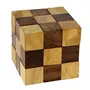 The wooden snake cube puzzle is made up of a long wooden chain of 27 "cubelets." By intricately bending placing and building the cubelets on top of one another you can create one solid cube. Each of the 27 cubelets is connected to one another with an elastic band on the inside to keep the cubes together but still bendable. When finished you'll have a 3-inch by 3-inch by 3-inch cube.