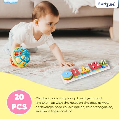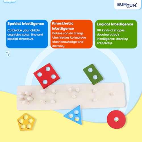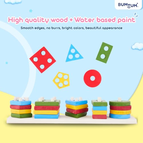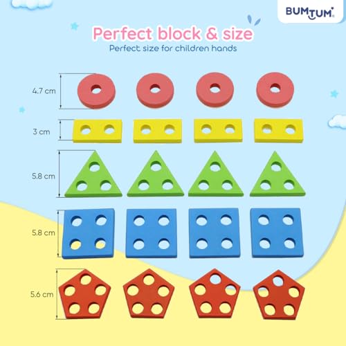 Bumtum Wooden 5 Shape Sorter & Stacking Toys | Geometrical Building Blocks Shape Sorting Toy for Kids Educational Learning Toy Stack