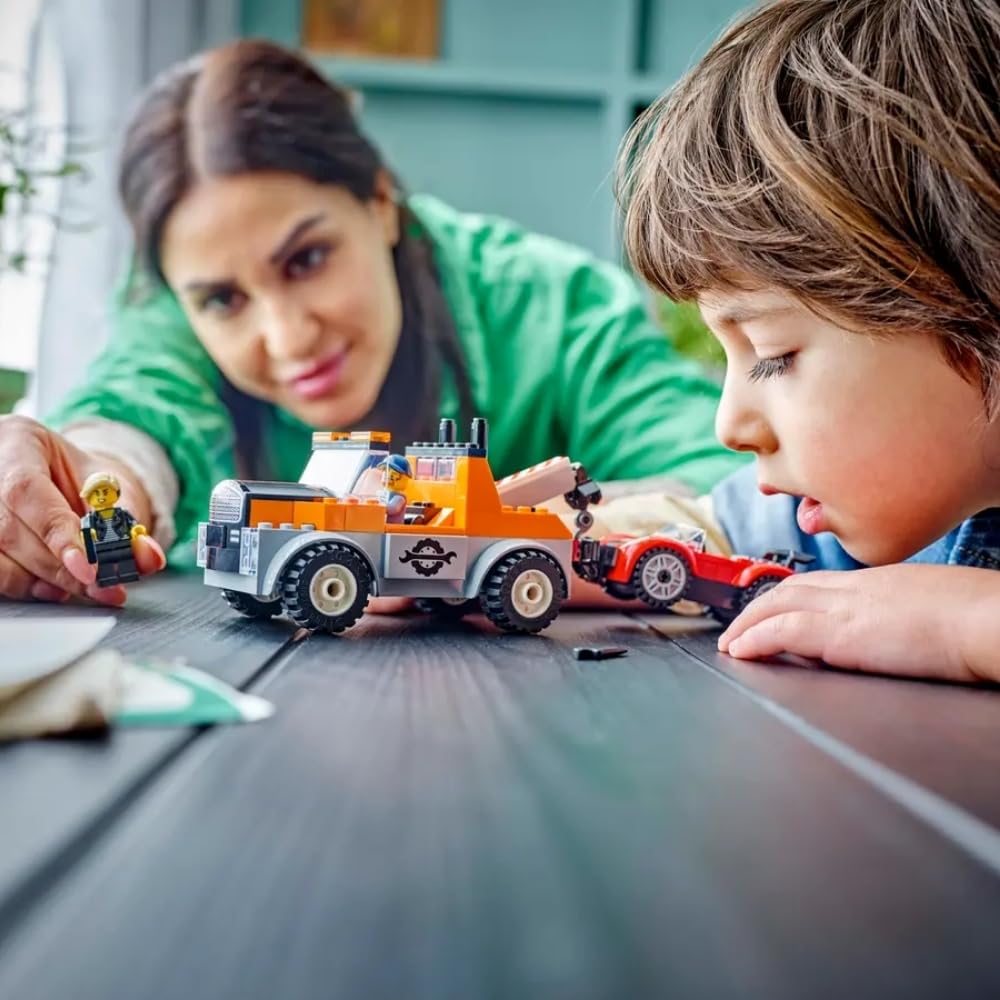 • Toy tow truck playset for ages 4+ Join your little hero for fun adventures with the LEGO City Tow Truck and Sports Car Repair playset for imaginative storytelling