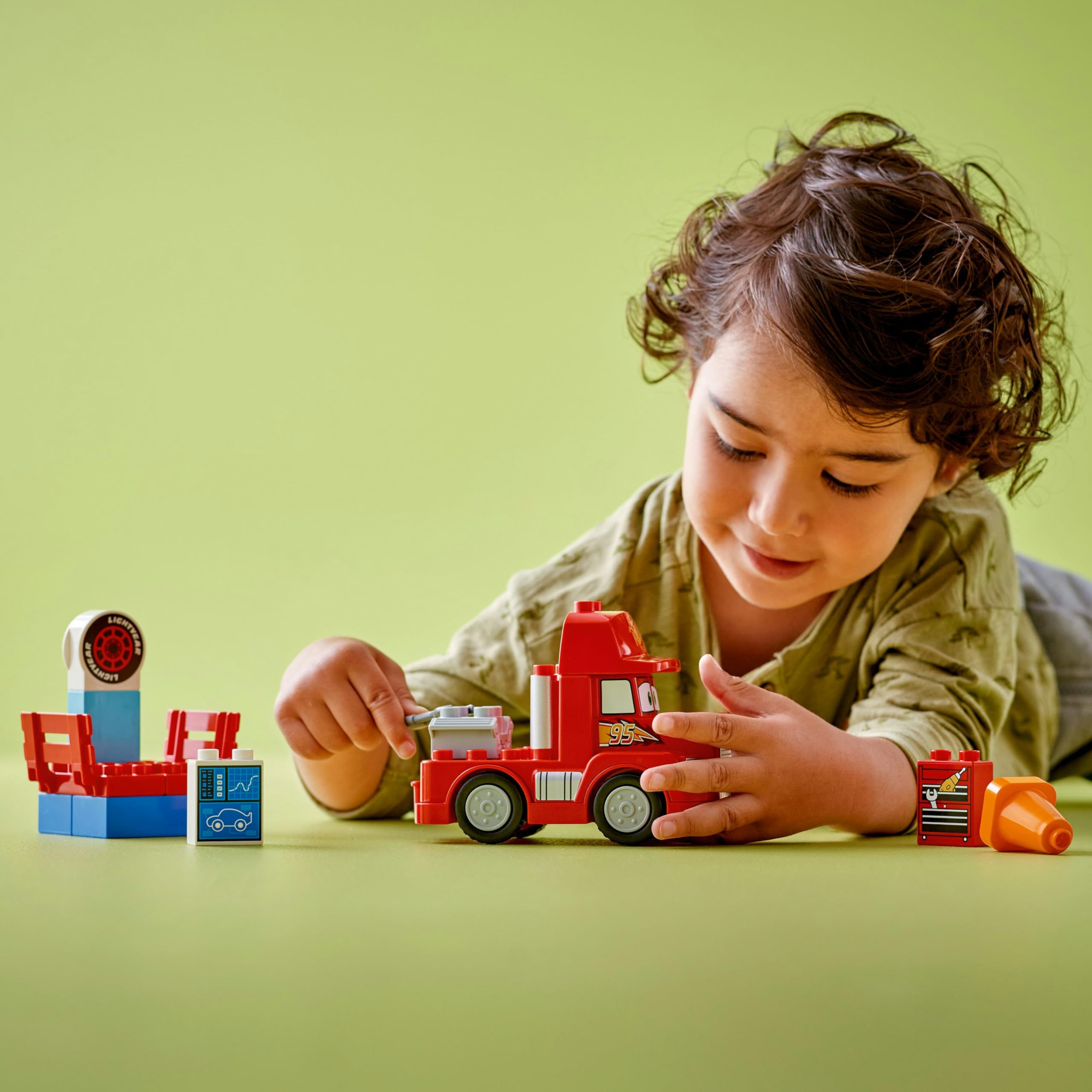 LEGO DUPLO truck with creative accessories Includes a drivable and buildable model of Disney and Pixar's Mack from the Cars movies plus a brick-built tuning station engine brick and a cone